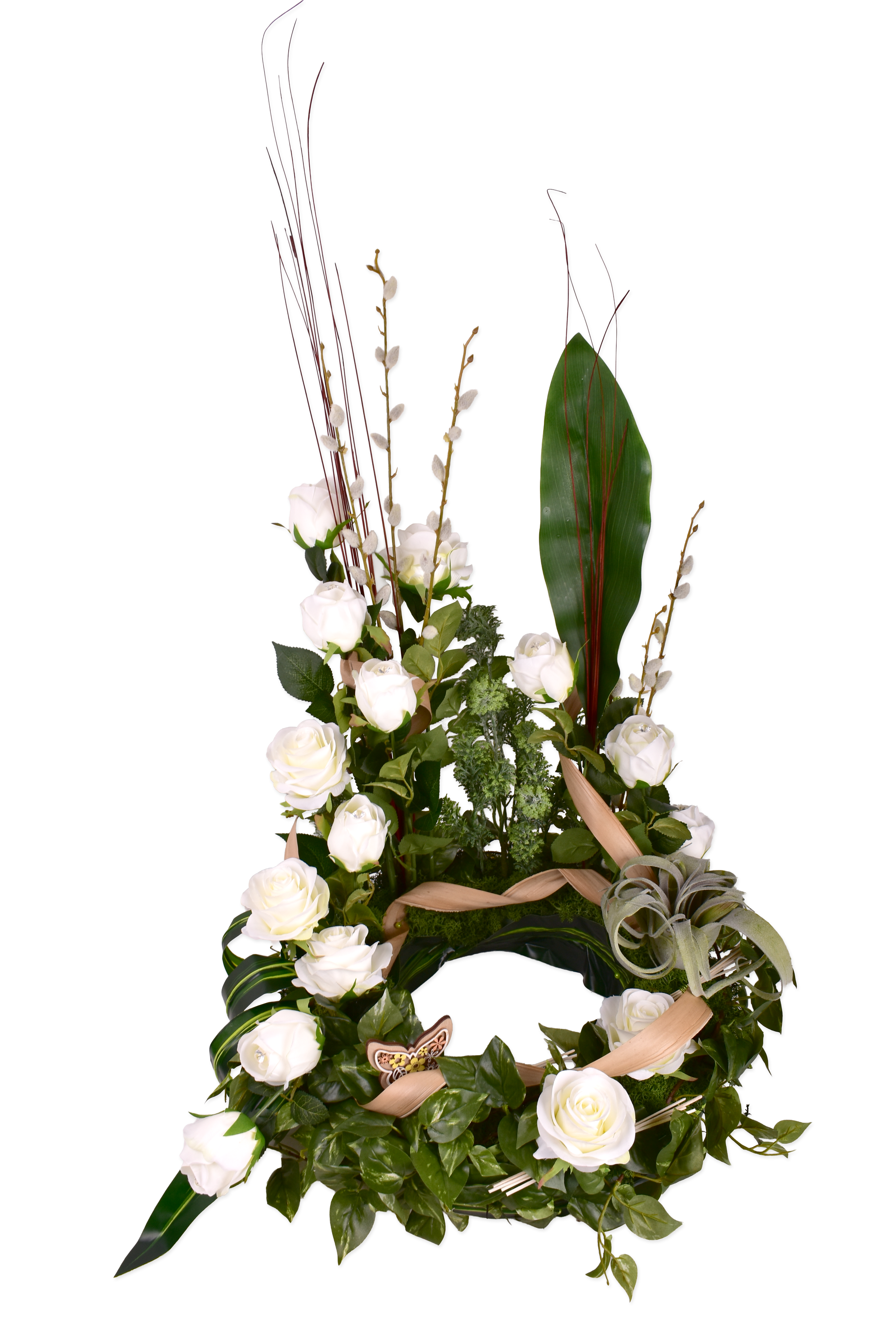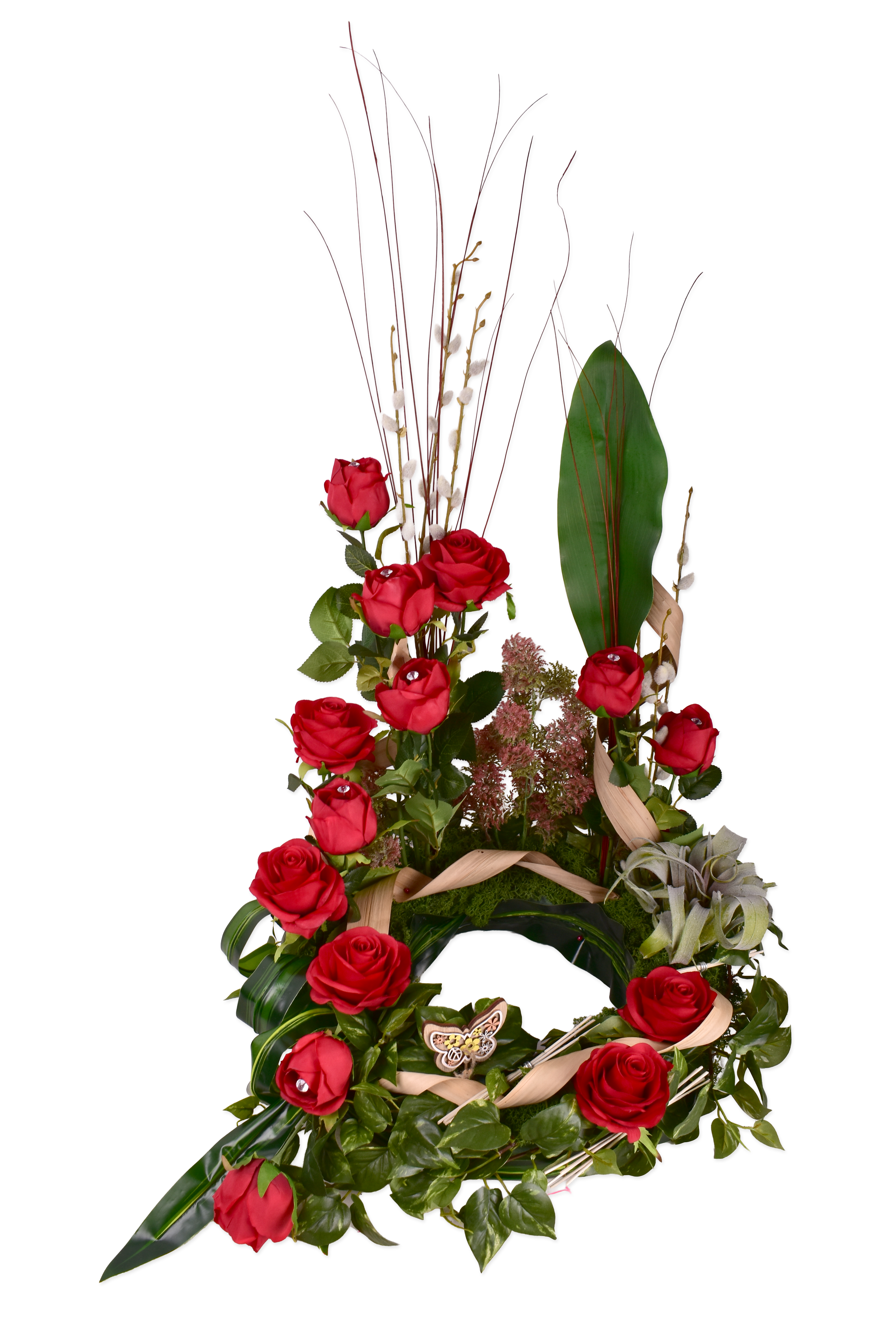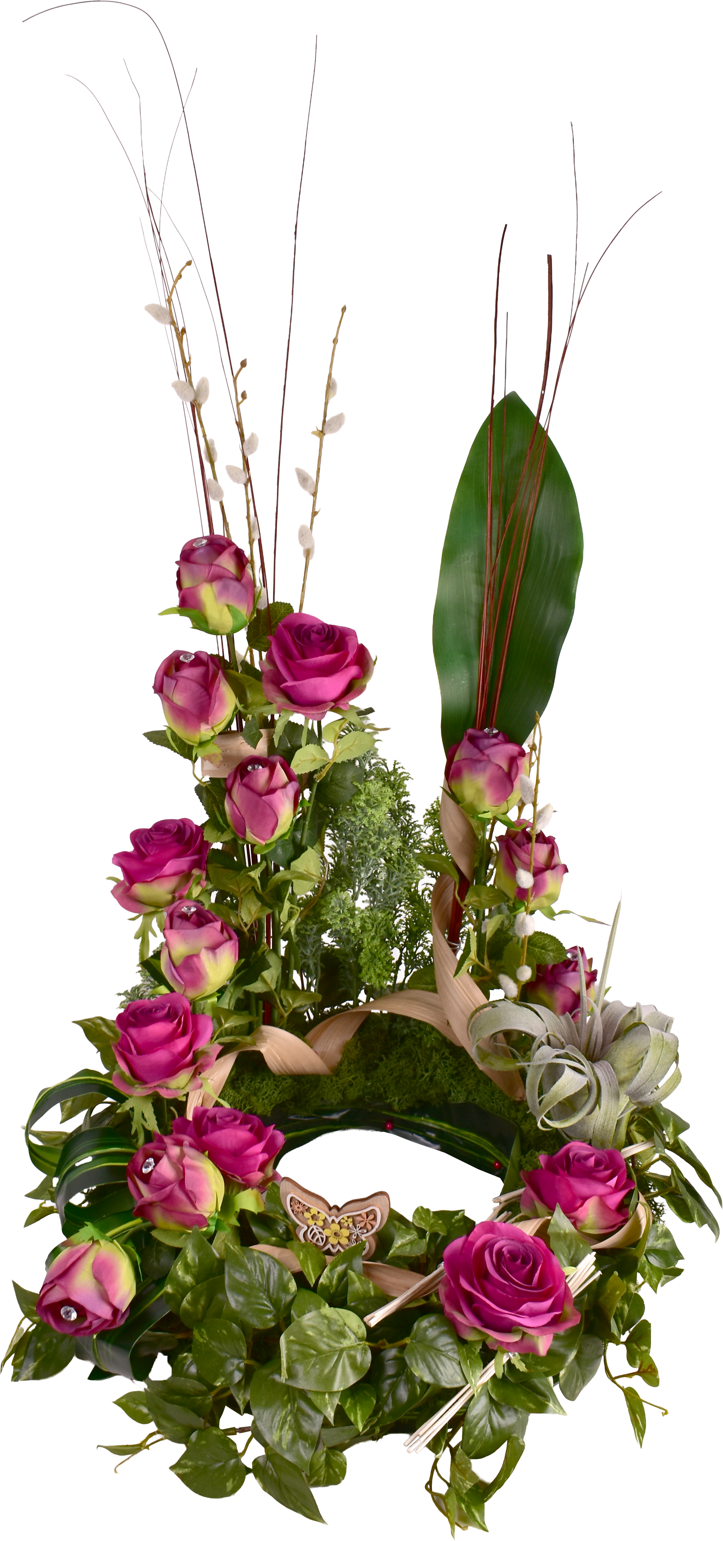 Décor d'urne, rose, bouton, echéveria.